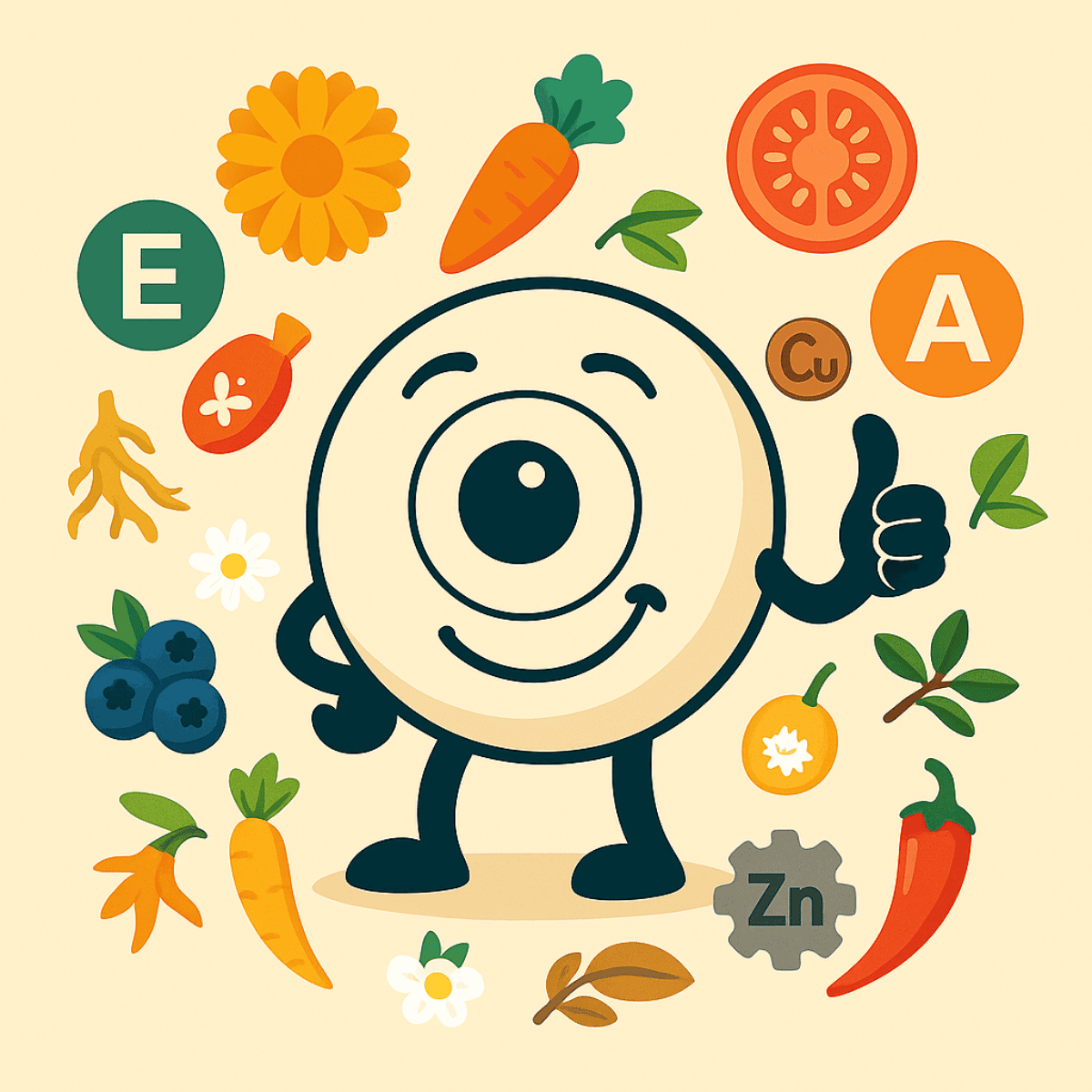 | Billberry Fuit Extract 4:1 (Vaccinium myrtillus), Eyebright Extract 4:1 (Euphrasia), Bayberry Root/Bark (Morella cerifera), Lycopene Extract 5%, Carrot Powder (Daucus carota), Organic Chamomile Flowers (Matricaria chamomilla), Oganic Goldeneal Root (Hydrastis canadensis), Organic Cayenne Powder (Capsicum annuum) | ||